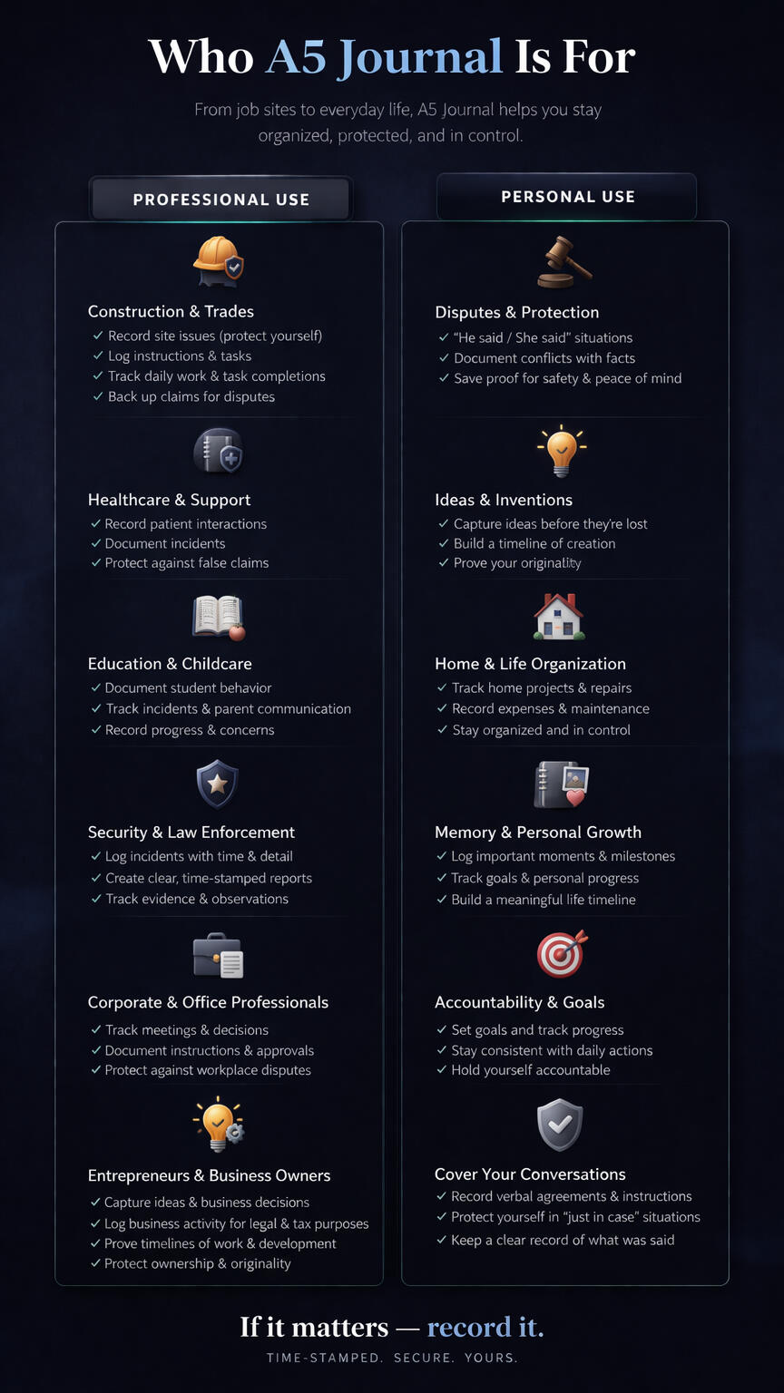 • Landlord/tenant issuesA timestamped, uneditable record strengthens credibility.⸻2. Personal AccountabilityTrack: